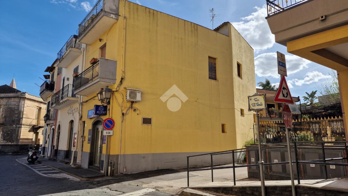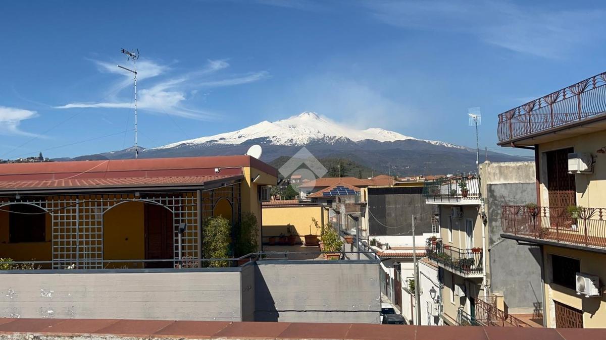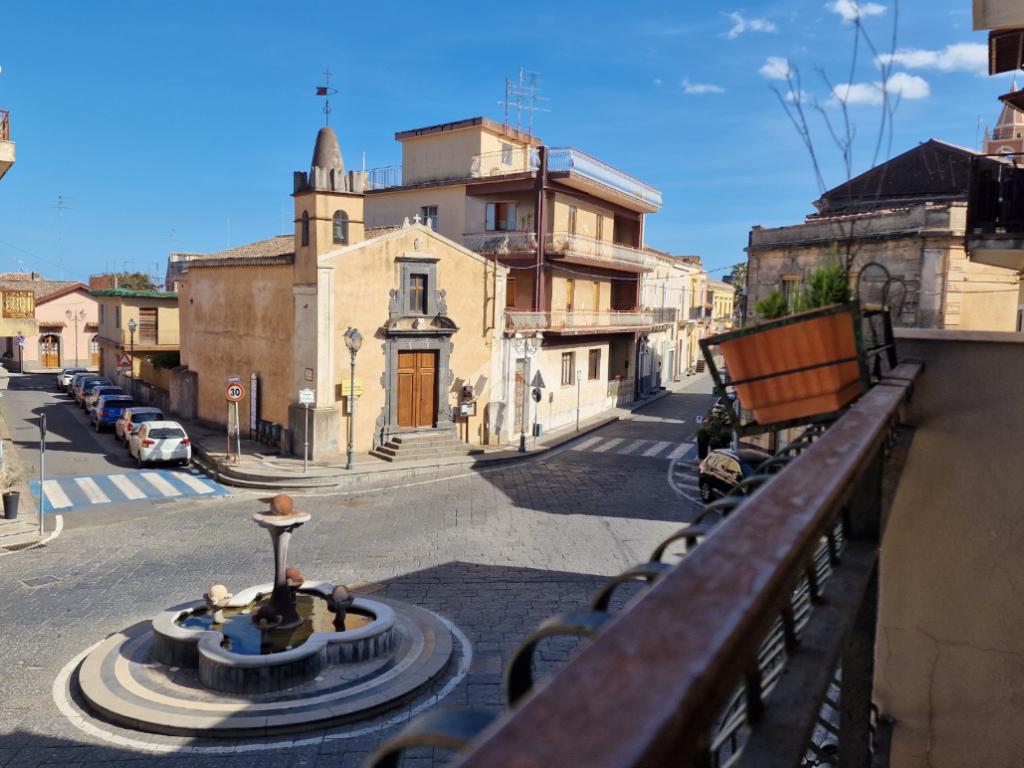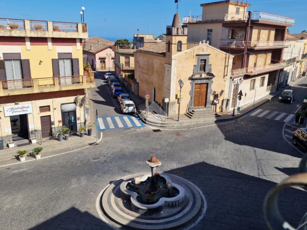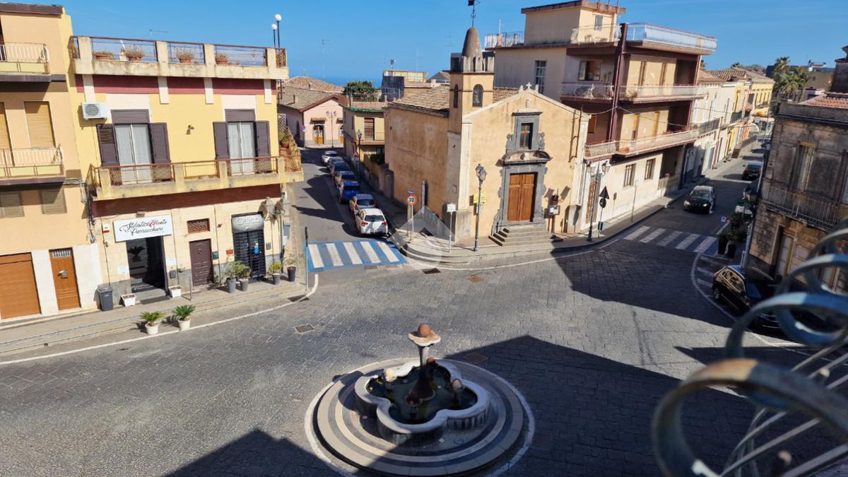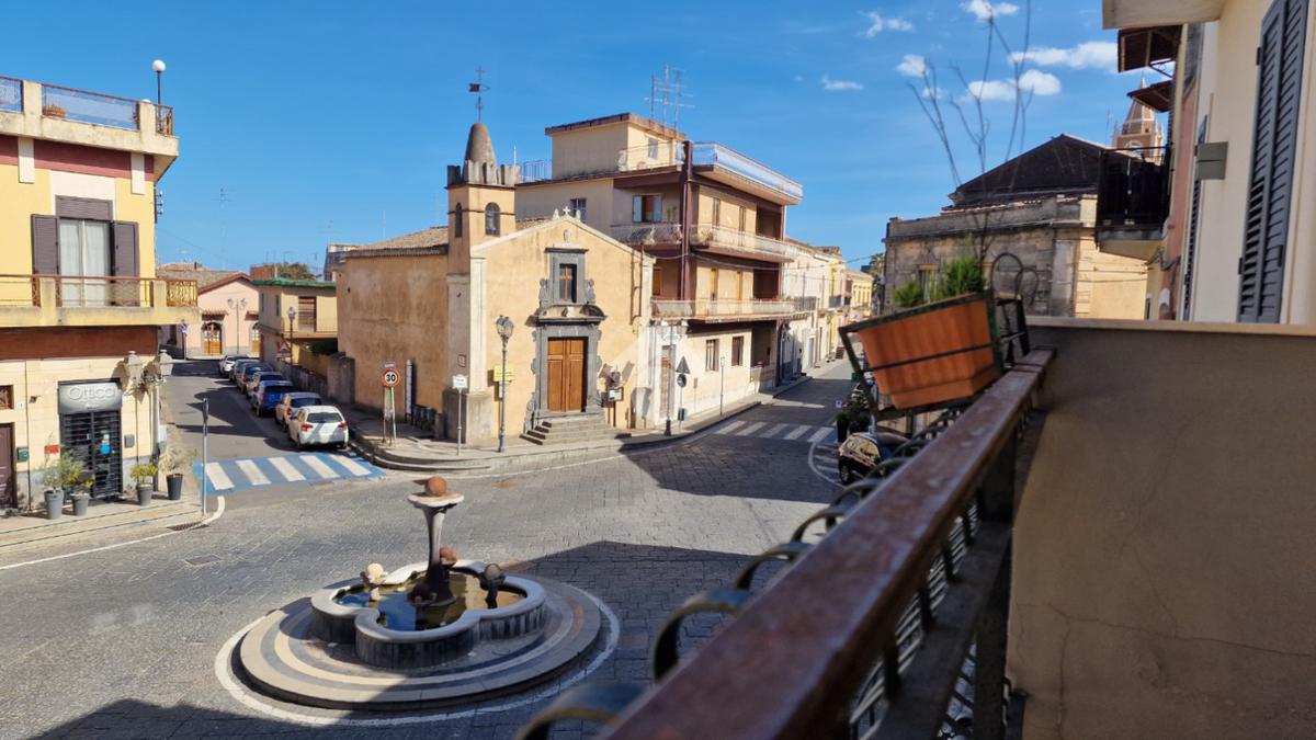 L'immobile: semindipendente al primo piano di un palazzetto edificato nel 1960 con bottega al piano terra. Ingresso con scala interna privata di accesso all'immobile ed al terrazzo sovrastante. L'ingresso è su disimpegno, due i vani in sequenza con angolo cottura ed il bagno a completare gli spazi interni di casa. Da una delle camere si ha uscita sul balcone con affaccio direttamente sulla piazza. Sovrastante la casa, il terrazzo di mq 41 con vista panoramica sull'Etna. Le condizioni son da ristrutturare, da rifare gli impianti elettrico ed idrico, riscaldamento assente ed infissi in legno monovetro. Da rifare il terrazzo sovrastante.
