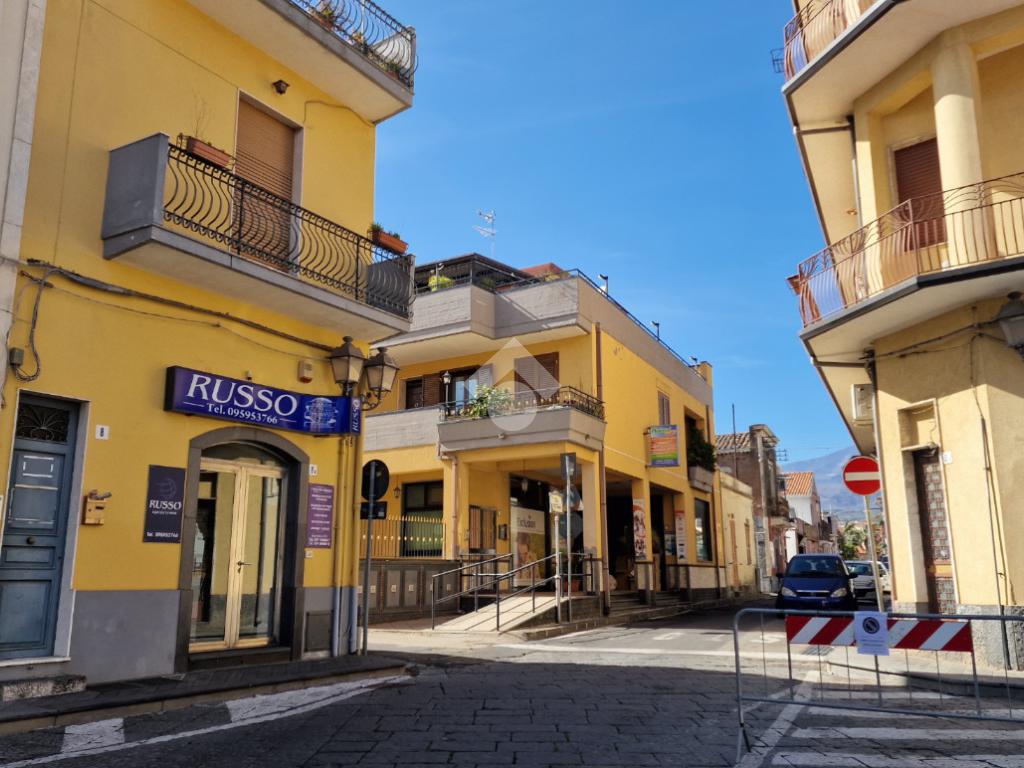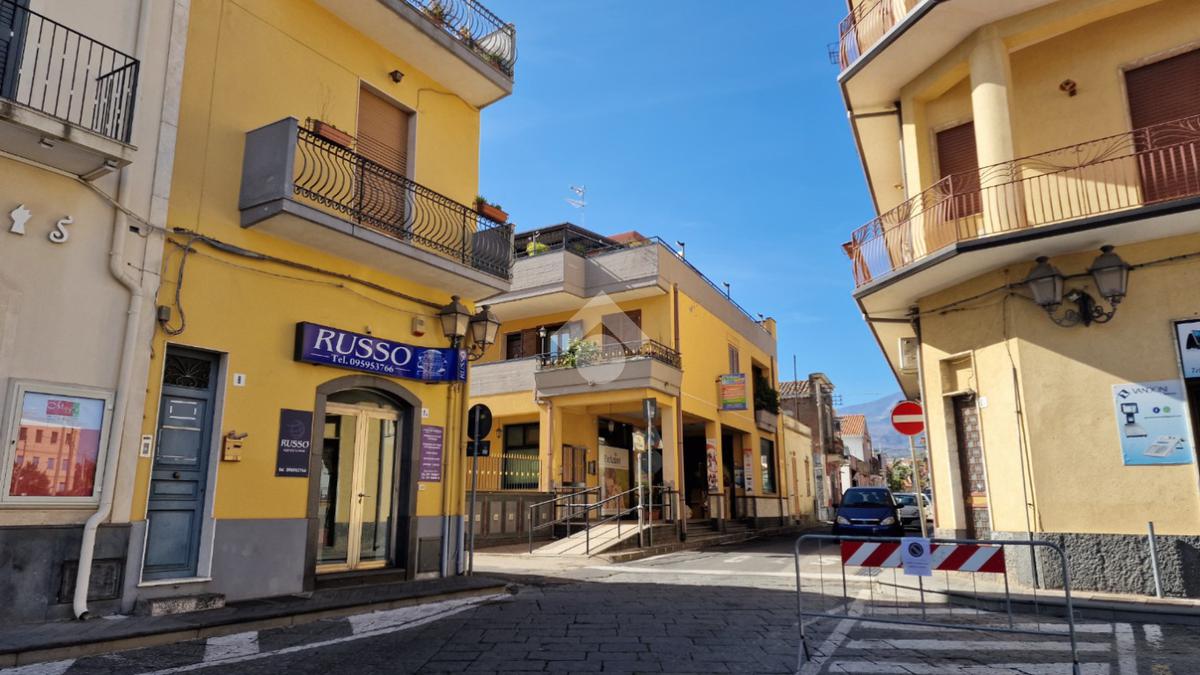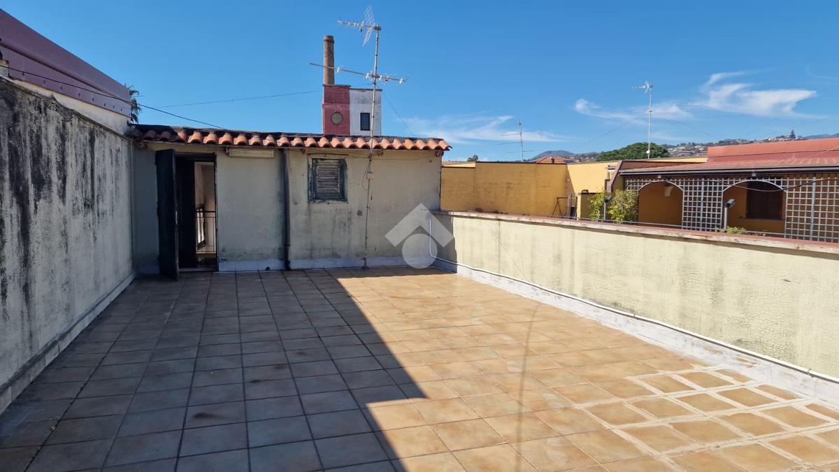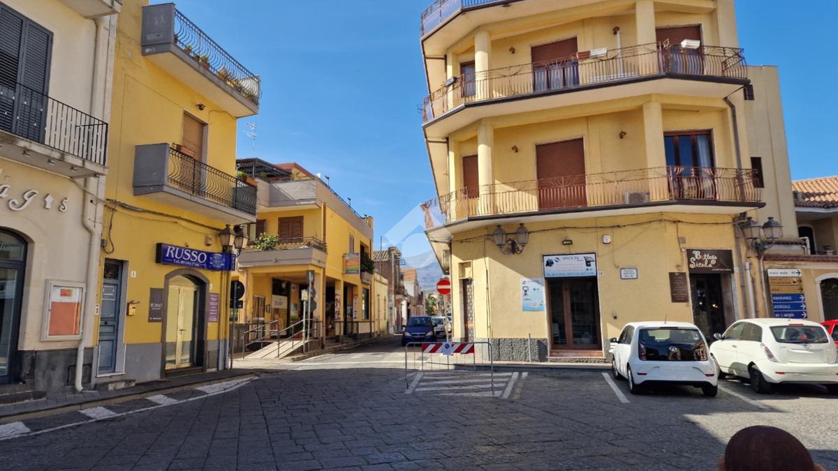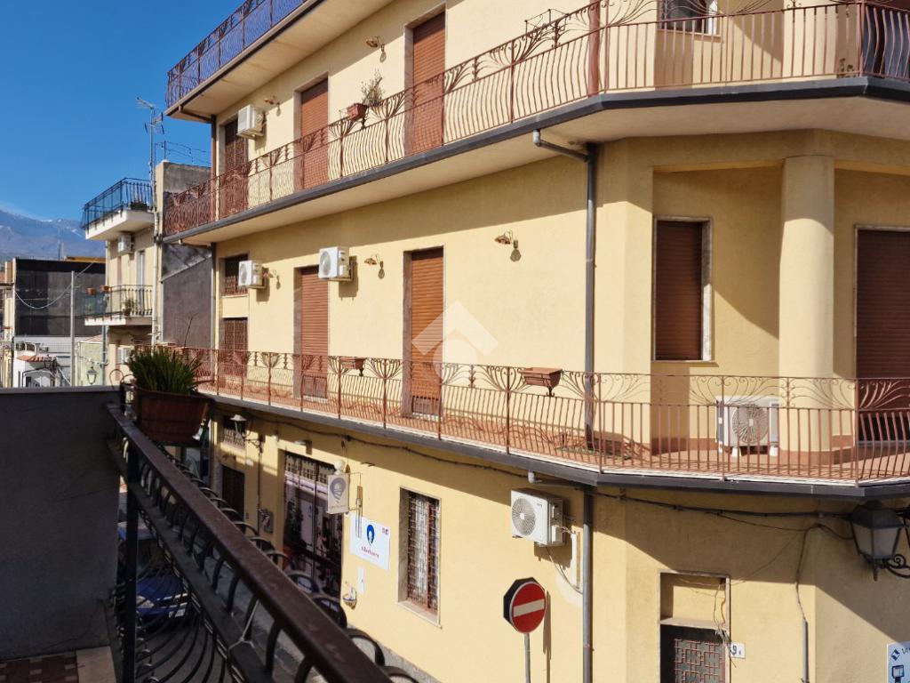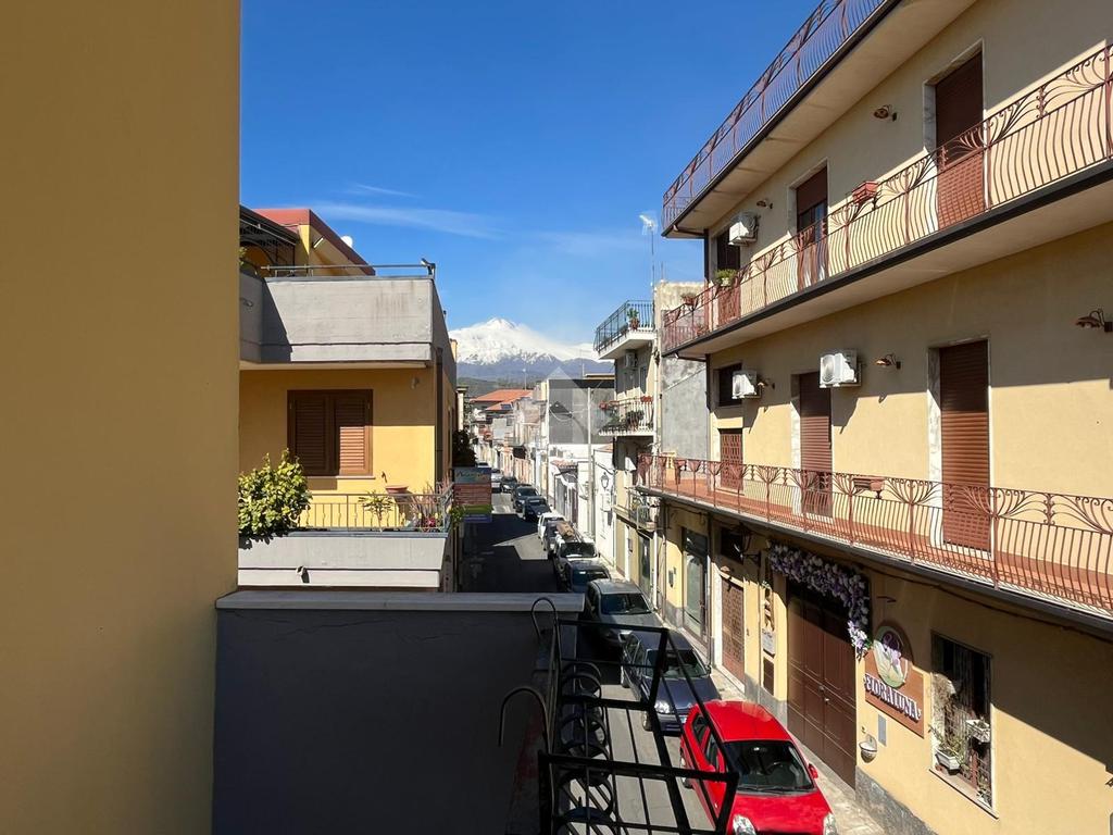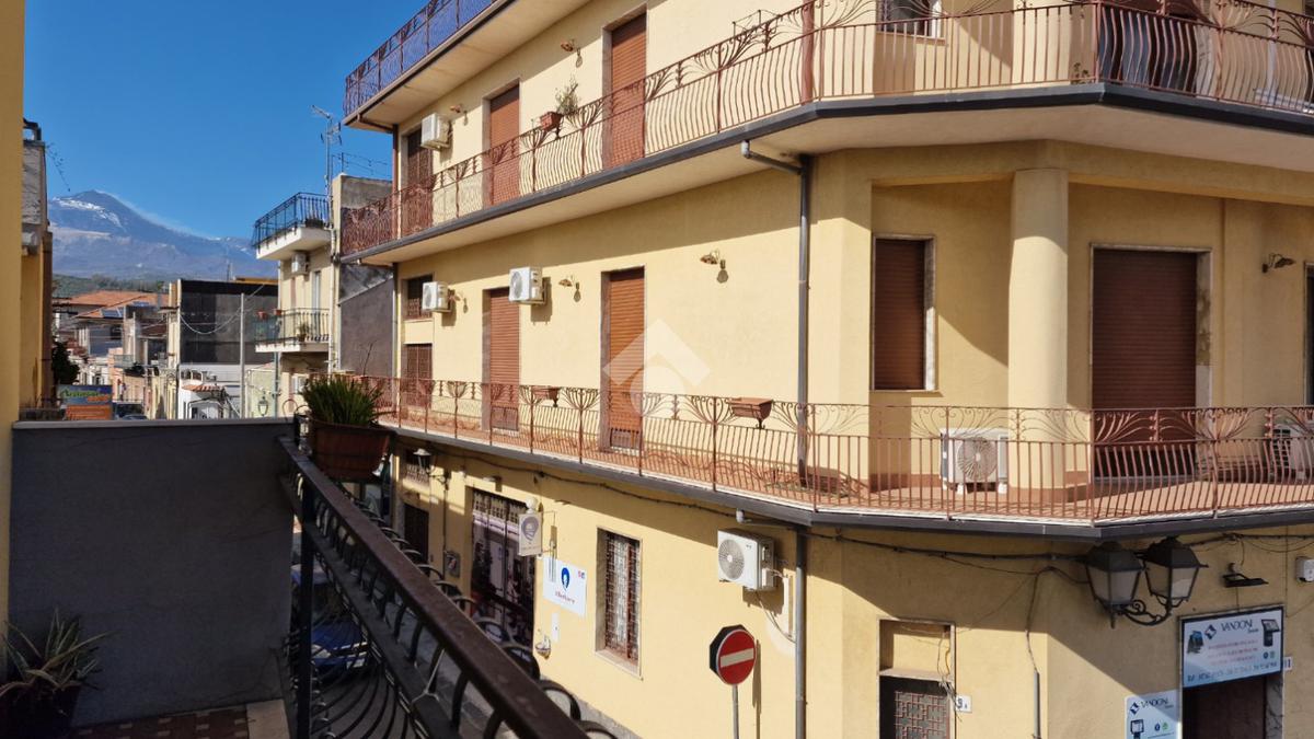 L'immobile: semindipendente al primo piano di un palazzetto edificato nel 1960 con bottega al piano terra. Ingresso con scala interna privata di accesso all'immobile ed al terrazzo sovrastante. L'ingresso è su disimpegno, due i vani in sequenza con angolo cottura ed il bagno a completare gli spazi interni di casa. Da una delle camere si ha uscita sul balcone con affaccio direttamente sulla piazza. Sovrastante la casa, il terrazzo di mq 41 con vista panoramica sull'Etna. Le condizioni son da ristrutturare, da rifare gli impianti elettrico ed idrico, riscaldamento assente ed infissi in legno monovetro. Da rifare il terrazzo sovrastante.