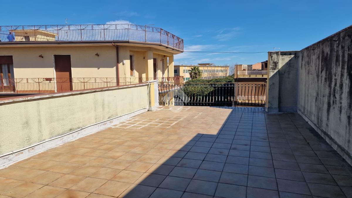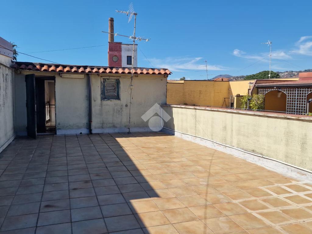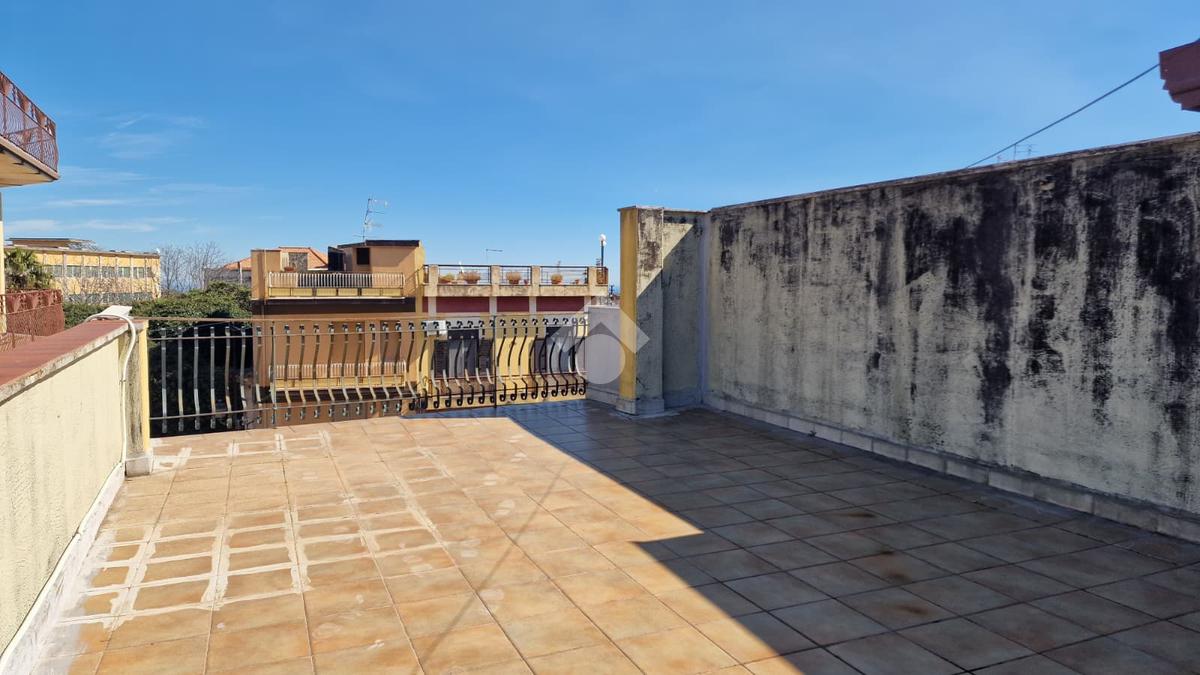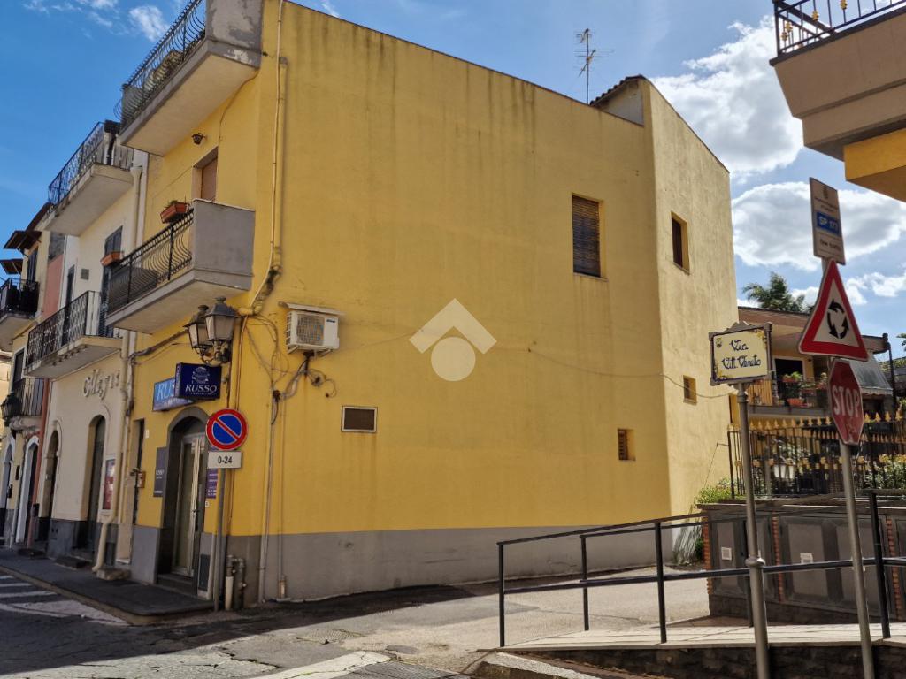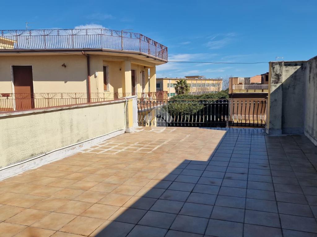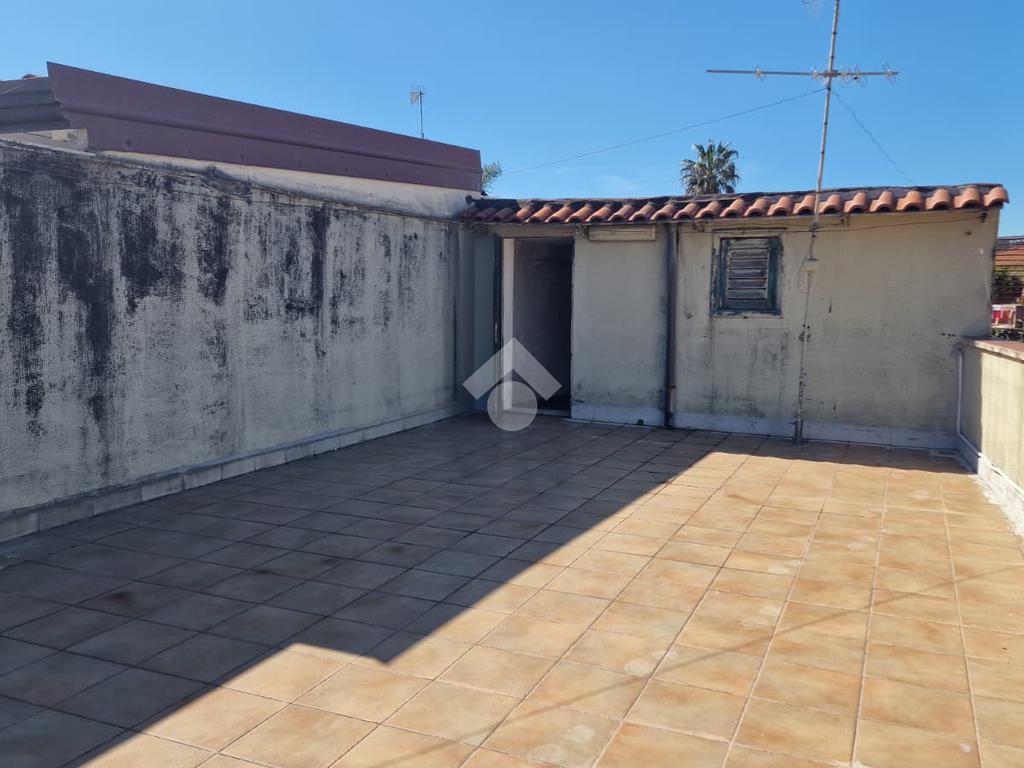 L'immobile: semindipendente al primo piano di un palazzetto edificato nel 1960 con bottega al piano terra. Ingresso con scala interna privata di accesso all'immobile ed al terrazzo sovrastante. L'ingresso è su disimpegno, due i vani in sequenza con angolo cottura ed il bagno a completare gli spazi interni di casa. Da una delle camere si ha uscita sul balcone con affaccio direttamente sulla piazza. Sovrastante la casa, il terrazzo di mq 41 con vista panoramica sull'Etna. Le condizioni son da ristrutturare, da rifare gli impianti elettrico ed idrico, riscaldamento assente ed infissi in legno monovetro. Da rifare il terrazzo sovrastante.